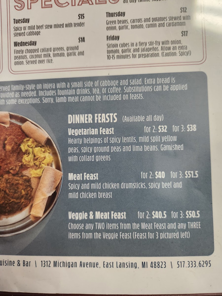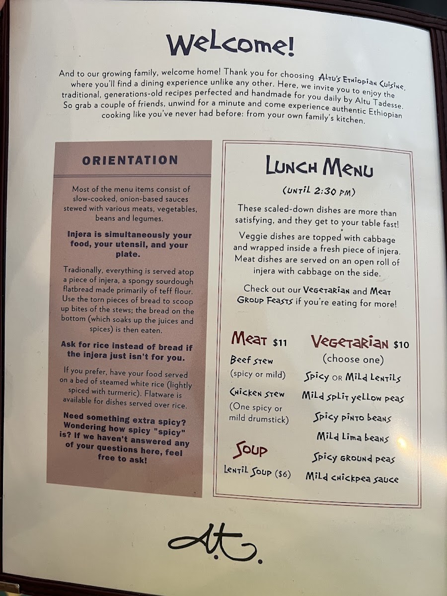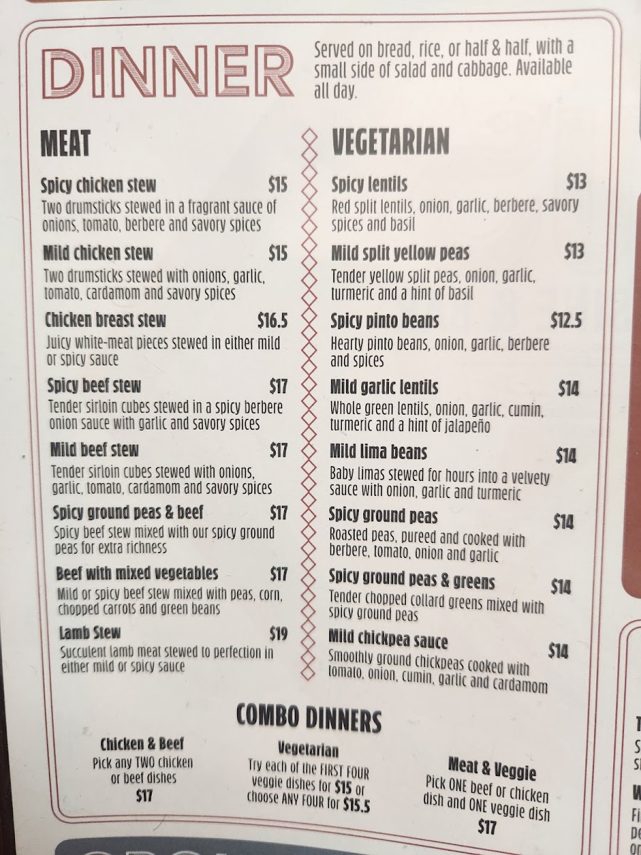 Introducing you to Altu's Ethiopian Cuisine, a hidden gem located at 1312 E Michigan Ave, East Lansing, MI. This vibrant establishment invites you to indulge in authentic Ethiopian flavors that are as rich in culture as they are in taste. Their dinner menu boasts a range of delights, including Spicy Beef Stew and Mild Beef Stew, both served on a generous piece of traditional injera, accompanied by fresh cabbage and salad.